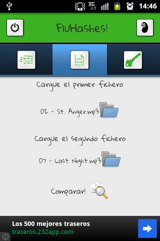 - Comparación de ficheros: el usuario podrá realizar comparaciones de ficheros almacenados en el dispositivo móvil a través de su hash. Los algoritmos disponibles son: MD5, SHA-1, SHA-256, SHA-384 y SHA-512.